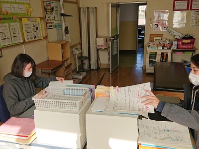 保健室の様子です。二人の養護教諭さんが小中児童生徒のために仕事をしています。