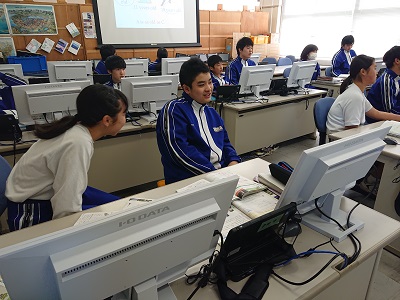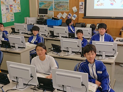 2年生は英語で比較級を使った英文を学習しました。テレビに映ったキャラクターの様子を見て、個々で英文をつくり発表しました。