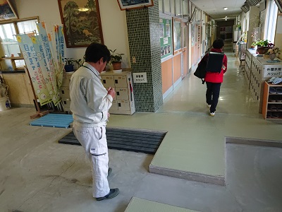 用務員さんが玄関清掃を行っています。いつも環境整備に心がけています。