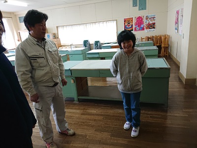 4年2組の児童が、畑の学習に際して用務員さんに相談ごとをしていました。