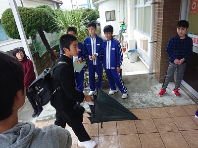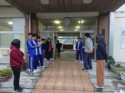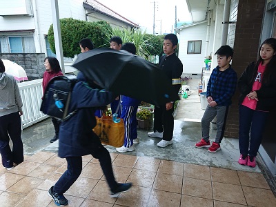 児童生徒と教員が玄関先で「朝のあいさつ運動」を行いました。小中学生同士で元気に声を掛け合っていました。