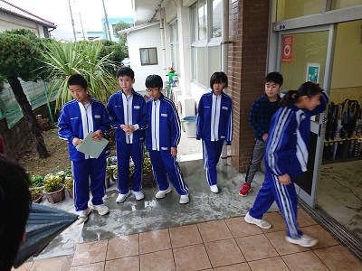児童生徒と教員が玄関先で「朝のあいさつ運動」を行いました。小中学生同士で元気に声を掛け合っていました。