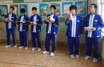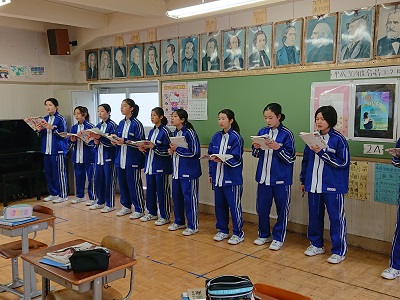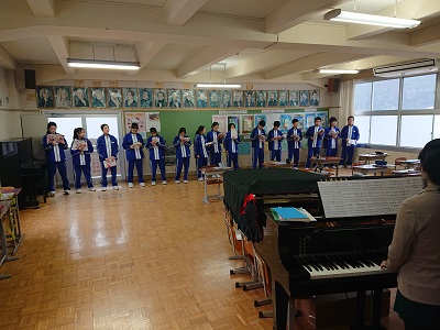 1年生は音楽で卒業式に向けた合唱曲について学習しています。強弱、音程などに気を付けながら正しい歌い方を練習しました。