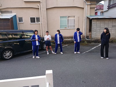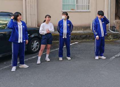 朝のあいさつ運動の様子です。中学生が登校してきた小中学生に声をかけています。