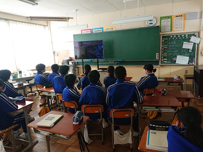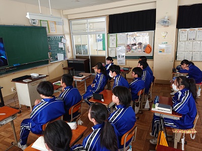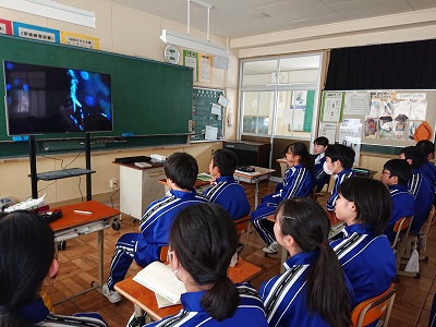 1年生は国語で、「イマジン(ジョン・レノン)」を学習しています。平和な世界を夢見て作詞された歌の意味について考えるため、その一助としてベトナム戦争を題材としたプラトーンという映画を視聴しました。