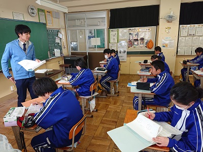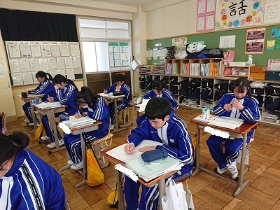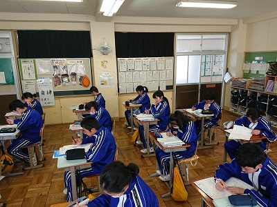 1年生は数学で「空間図形 〜図形の計量〜 」について学習しています。単元テストが返却され、テスト直しを行っていました。