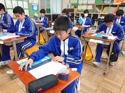 2年生は数学で、これから始まる学習書の使い方についてガイダンスがありました。また、製本テープを使い、問題集とノートをまとめていました。