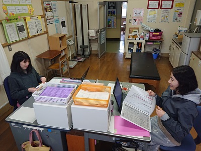 保健室の様子です。二人の養護教諭さんが小中児童生徒のために仕事をしています。