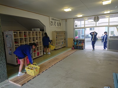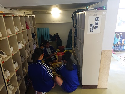 女子ソフトテニス部は、全員でボールの空気入れを行っていました。
