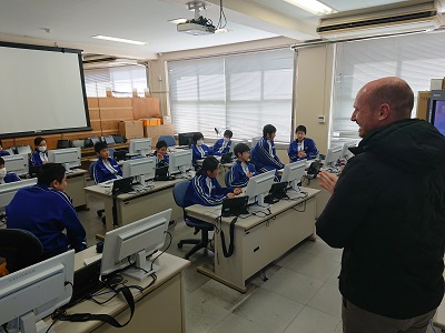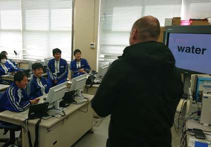 2年生は言語科「英語の時間」において、ALTのアーロン先生と英会話を楽しみました。渡邉先生とアーロン先生の会話を聞いて、生徒は笑っていました。