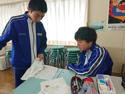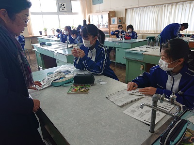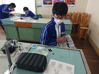 1年生は家庭科で「機能もばっちりエコティッシュカバー」の作成を行っていました。針と糸を上手に使って作業をしています。