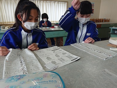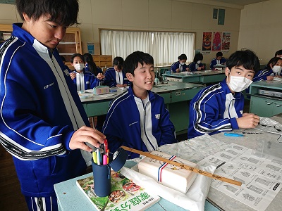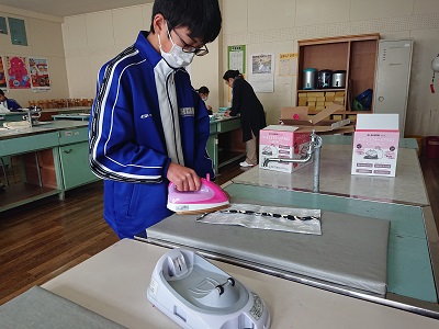 1年生は家庭科で「機能もばっちりエコティッシュカバー」の作成を行っていました。針と糸を上手に使って作業をしています。