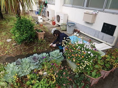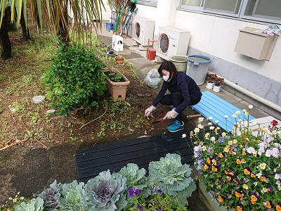 スクールサポートスタッフさんが、校内環境整備として児童生徒玄関付近の草取りをしています。