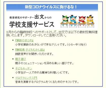 静岡県出版文化会より、臨時休校中の学習に活用できる教材が無料で提供されています。算数のまとめ、静岡県のむかし話の朗読音声、親子あそび、子どもキッチンなど、5つの教材がダウンロードできます。