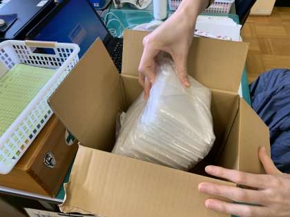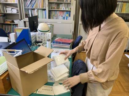 全員分の布マスクが届きました。養護教諭が一枚一枚、不備がないかチェックをしました。配布や使用については後日お知らせします。