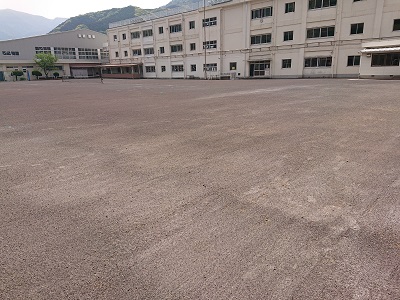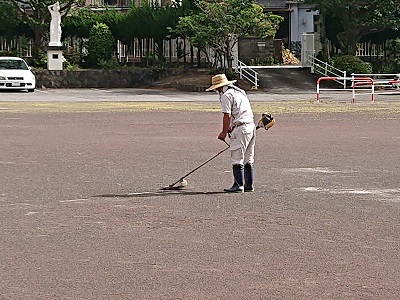 用務員さんが、グラウンドの雑草とりを行っていました。用務員さんが草刈り機を使ってきれいにしています。