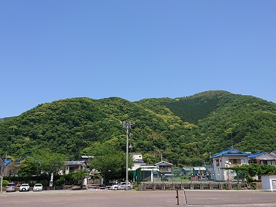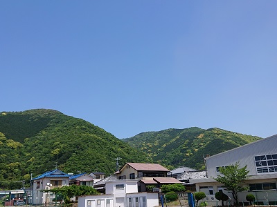 本日も五月晴れのよい天気です。学校北側は新緑の山々です。