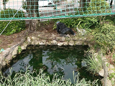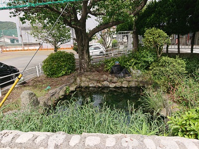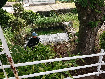 学校池周りを整備しています。学校再開後にすぐ使えるよう準備をします。