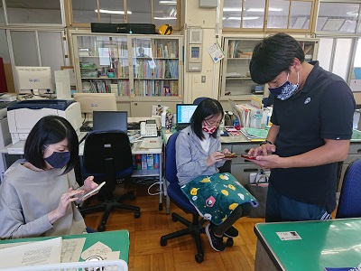 生徒の皆さんとのつながりをつくったり、学習内容の解説をしたりできるようにと、ICT活用研修を行いました。パソコンやスマートフォンを使って、ミーティングやセミナーにオンラインで参加できるアプリを使用して、活用の仕方について共通理解を図りました。