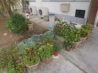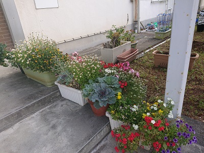 玄関付近の様子です。「戸田花の会」の皆様からいただいた花々がきれいに飾られています。