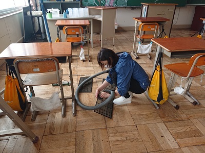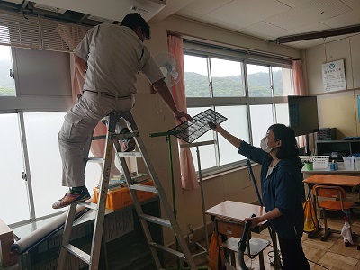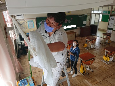 学校再開に向けて、用務員さんとスクールサポートスタッフさんが、エアコンの掃除をしています。