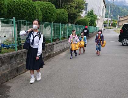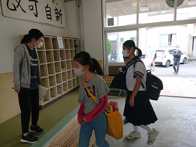 学校再開となり、戸田小中の子どもたちが久しぶりに登校しました。3密に気をつけながら校舎に入りました。