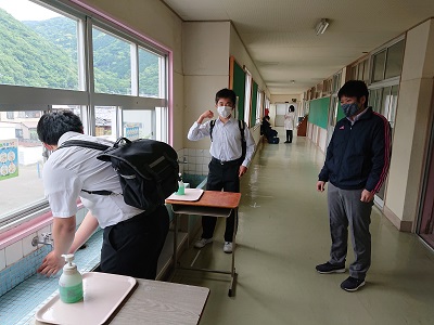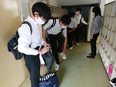 中学生は靴箱から3階水道へ移動します。水道では、担当教職員が見守る中・うがいと手洗いを行います。