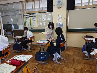 1年生学級活動の時間です。学年主任と学級担任、養護教諭が生徒一人一人に声をかけています。