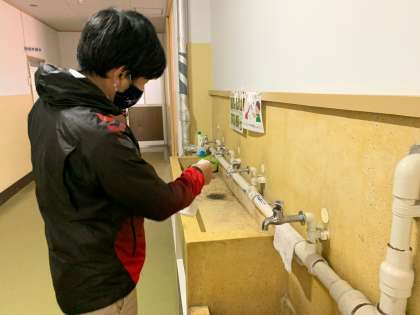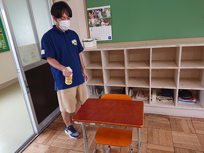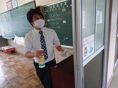 子どもたちが下校した後、教職員が教室等の環境整備を行いました。ドアノブ、手すり、机の上などを消毒しました。