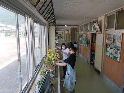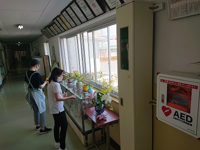 養護教諭とスクールサポートスタッフさんが、事務室前の花瓶の花を入れ替え、新しくしていました。