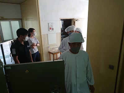 1階ワゴン前では、養護教諭が給食配膳前のチェックを行っています。
