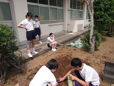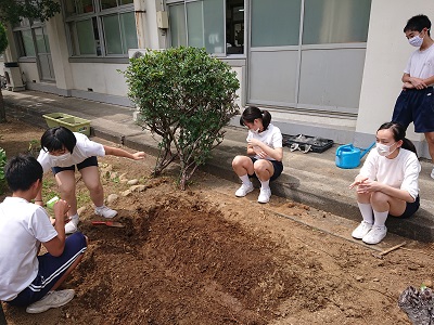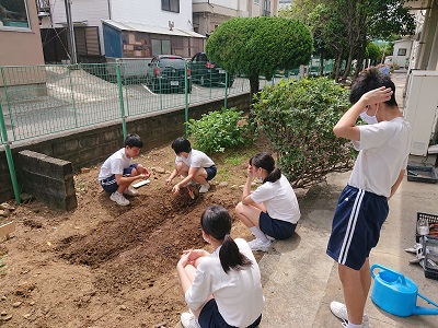 本日の昼休みに、3年生は技術科で育てている小松菜の様子を観察したり、新たに種をまいたりしていました。