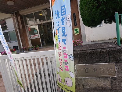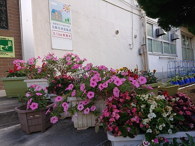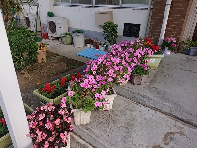 玄関の様子です。玄関前には「戸田花の会」の皆様からいただいたペチュニアやベコニアがきれいに咲いています。