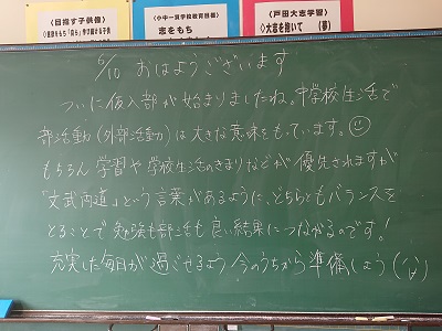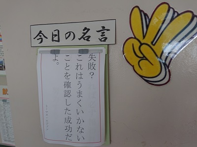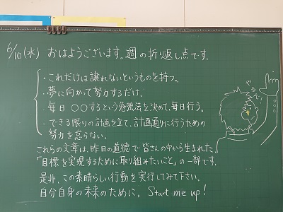 各クラスには、学級担任が思いを込めて用意した「黒板メッセージや今日の名言」が掲げられています。