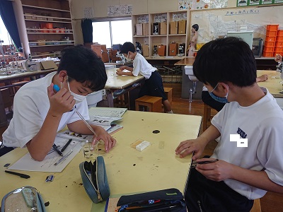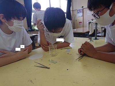 1年生は理科で「微生物を観察しよう」という学習を行っています。ミジンコを観察するためにプレパラート作りをしました。