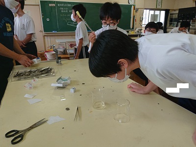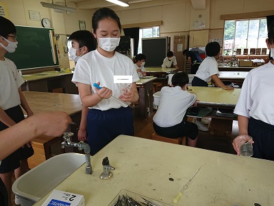 1年生は理科で「微生物を観察しよう」という学習を行っています。ミジンコを観察するためにプレパラート作りをしました。