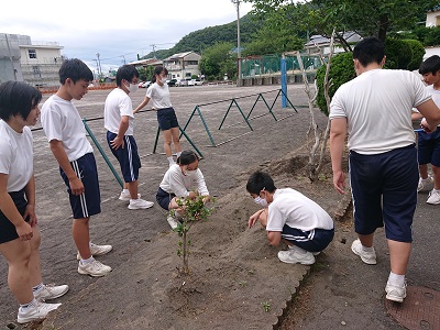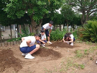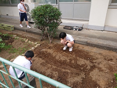 3年生は技術科で「作物の栽培」について学習しています。小松菜を5グループでそれぞれで栽培しています。畑や砂地、種まきの時期、深さ、間引きの仕方など、よく考えながら育てています。