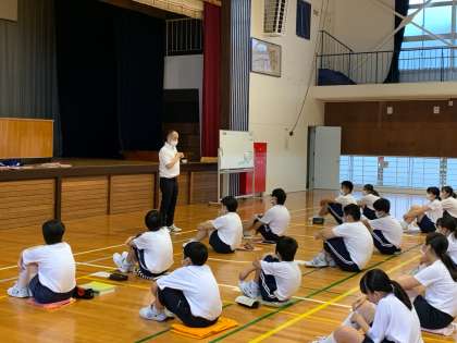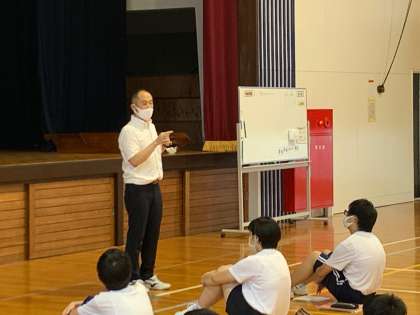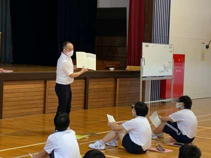 全学年で、言語科「読解の時間」を行いました。今年度、本校では「天声人語書き写しノート」を使って視写を行います。最初に澤村先生からノートの使い方について話がありました。