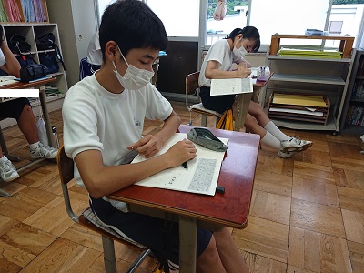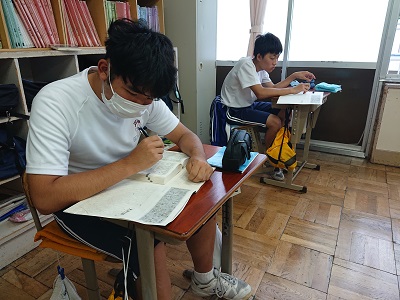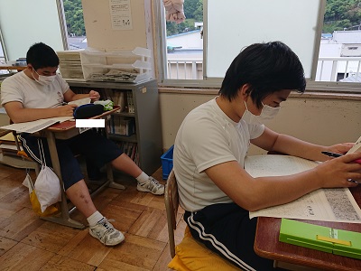 3年生の朝の潮風タイムの様子です。みんな集中して「天声人語の視写」を行っています。3年生は国語辞典も使いながら学習しています。