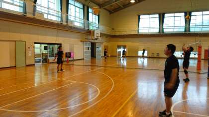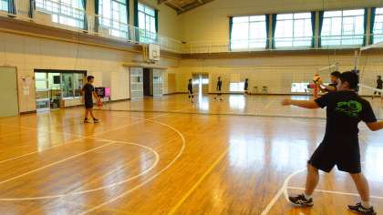 男子バレーボール部の練習の様子です。長井崎中の選手と声を掛け合い練習しています。