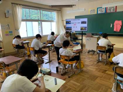 1年生は社会で「古代文明」について学習しています。メソポタミア文明・エジプト文明・インダス文明・中国文明の4つの文明の共通点について、教科書や資料集から読み取り、分かったことを紹介し合いました。