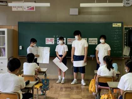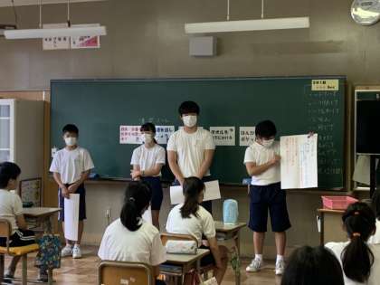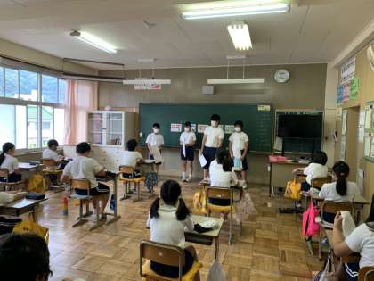 本日の昼休みに自治総会を行います。自治総会に出席しない小学生に対して、自治会役員が丁寧に説明しています。