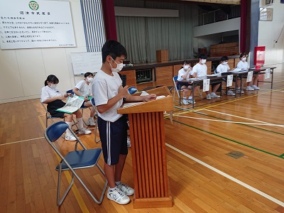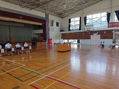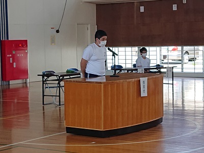 本日の昼休みに、「令和2年度前期自治総会(前半の部)」を開催しました。司会を自治会長が行い、自治副会長が「はじめの言葉」を話しました。