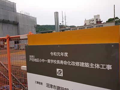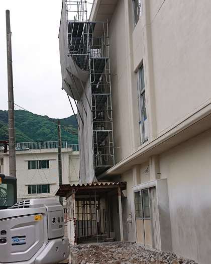 日々、戸田小校舎改築工事を進めています。小学校校舎東側に非常用階段を設置する工事を行っています。