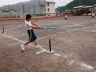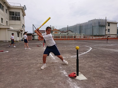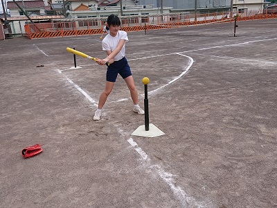 2年生は体育でベースボール型の学習を行っています。ティーバッティングスタンドを使って打撃練習を行っています。