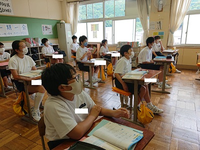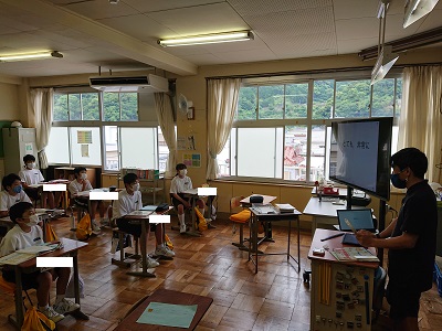 1年生は英語でPROGRAM2を学習しています。最初に既習英単語の確認を大型テレビ(提示装置)を使って速読していました。