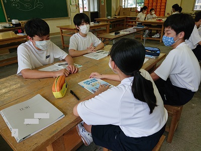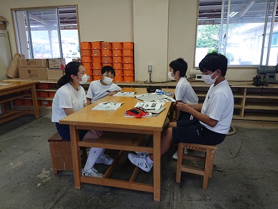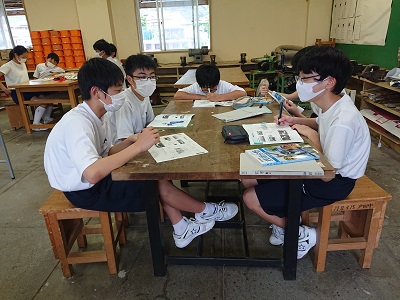 1年生は技術の学習で、「身近な技術」について話し合いました。技術が進化すると、逆に大なり小なり問題も起きます。今日は、地球温暖化などの問題をグループで話し合いました。