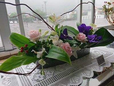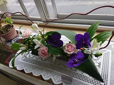 小池先生が1階校長室前に、ヨーロピアンフラワーアレンジメント「ヴィンデント」を飾ってくれました。いつもありがとうございます。
