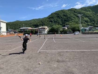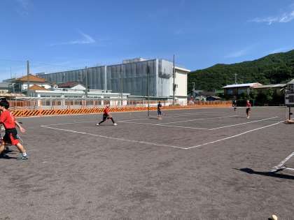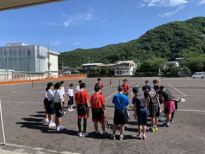 ソフトテニス部の様子です。部長を中心にあいさつをして練習がスタートしました。
