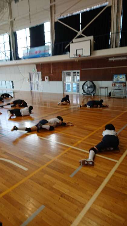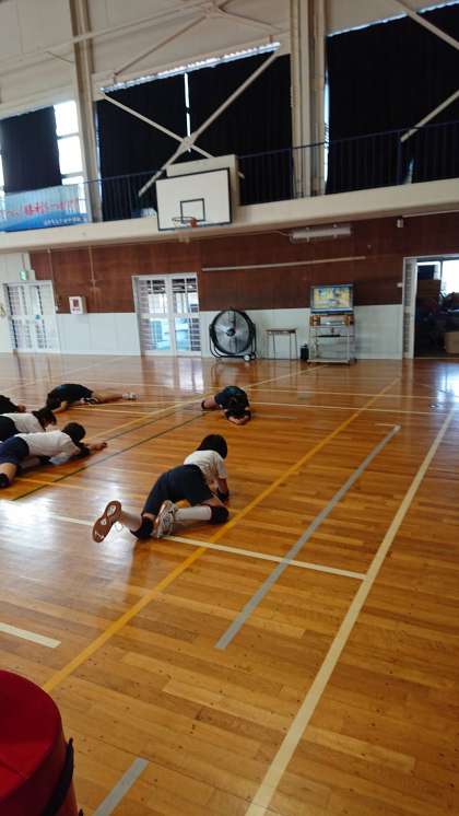 女子バレーボール部は、1年生の本入部で、4名が新たなメンバーとして加入しました。映像に合わせてウォーミングアップを行いました。